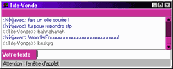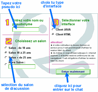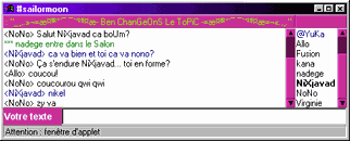 Pour profiter pleinement du Chat nous vous recommandons d'utiliser la version Java du chat. Celle ci nécessite un navigateur de génération 3 et plus comme Internet Explorer ou Netscape Navigator. Si votre Navigateur n'est pas compatible java ou si votre ordinateur se trouve derrière un serveur "proxy" utilisez la version Html du Chat.
