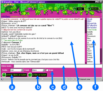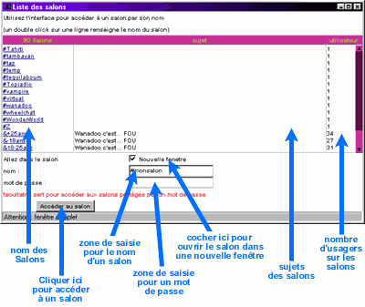 Dans cette fenêtre se trouve la liste de tous les salons présents sur le réseau créés par des utilisateurs. Ces salons ne sont pas affiliés avec Wanadoo, bien que vous ayez la possibilité d'y aller à votre guise, Wanadoo ne contrôle ni n'approuve le contenu de ces salons.